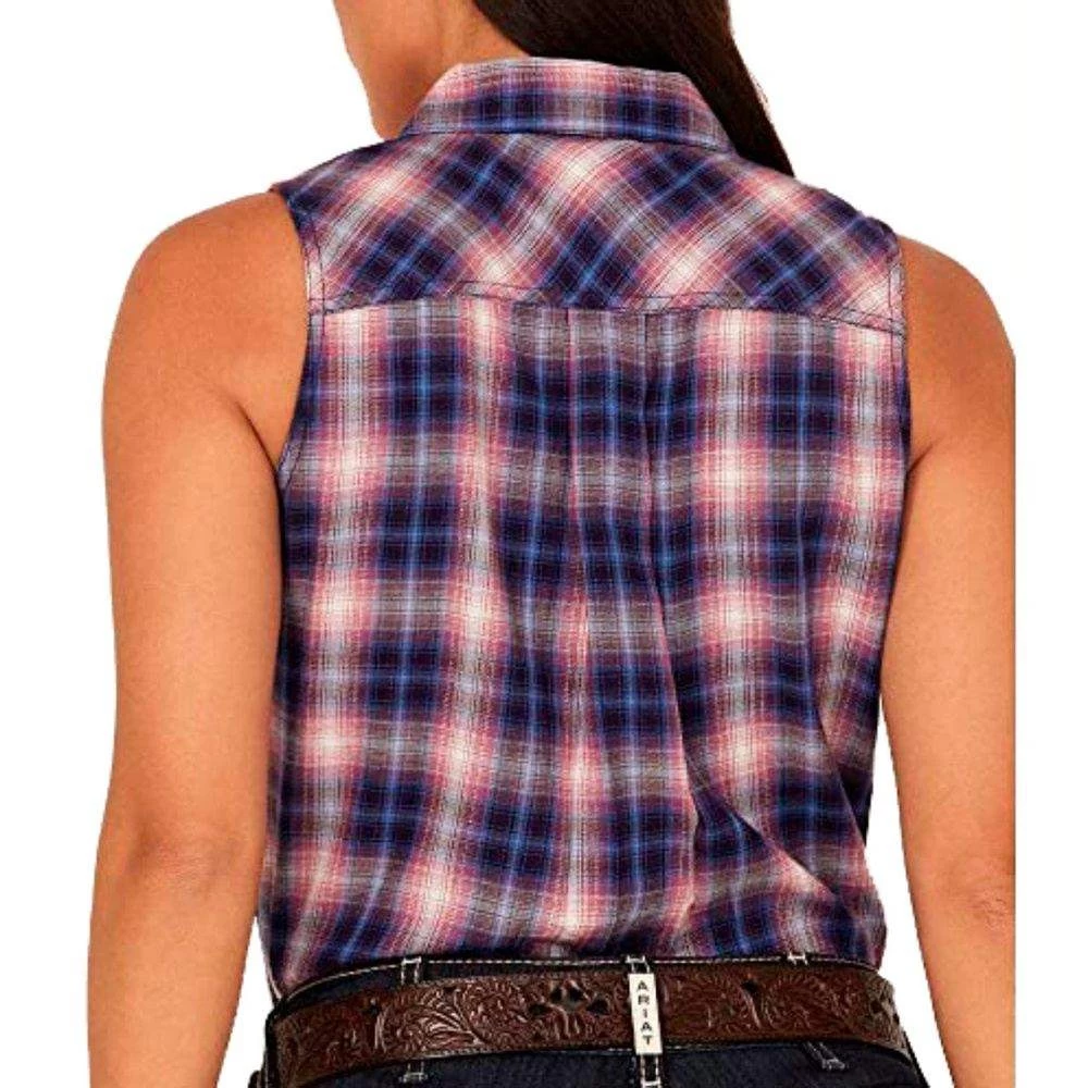 A great spring and summer shirt that is also great for layering. This sleeveless button down plaid shirt is cotton with a plaid print and western yokes. Goes great with jeans!