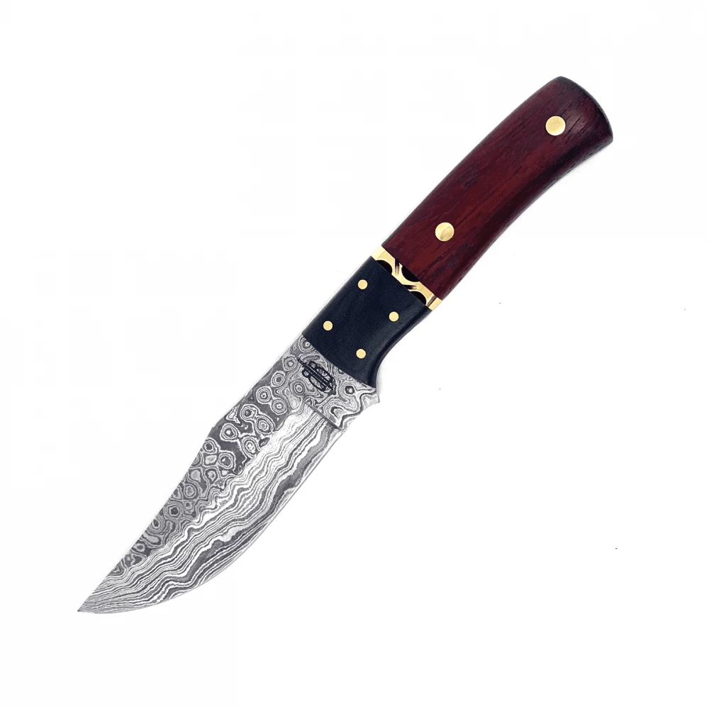This gorgeous clip point hunter has a 1095 Rain Drop Damascus blade with full tang construction. The blade is 3/16″ thick and 1 1/4″ deep. Filework on thumb rest for extra grip. The bolster is G10 and handle is African Padauk Wood with brass pins. Fileworked brass spacer divides the beautiful handle materials. This knife comes with a hand-stitched leather sheath.