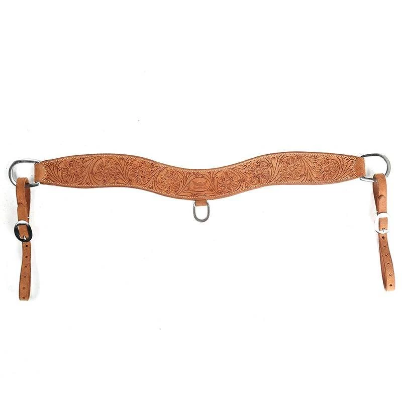 This 3″ Breast Collar by Cactus is part of the Trevor Brazile Signature Tack Line. It is 3″ Leather and is hand floral tooled and Rough Out leather. It has a contoured shape, steel hardware, and leather tugs.