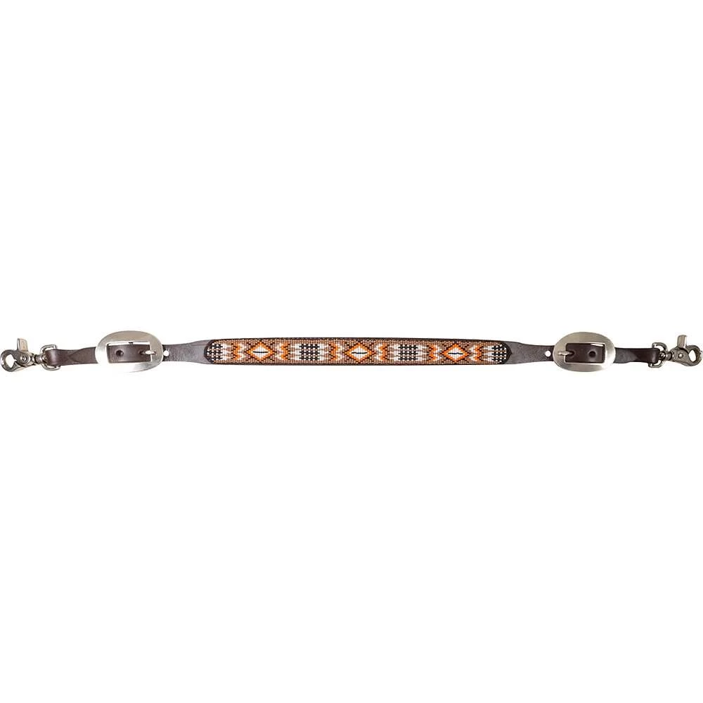 The Cashel beaded wither strap is made of chocolate skirting leather with tan/orange beaded accents.