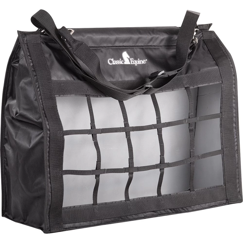 The Classic Equine Moderate Feed Hay bag has smaller squares to lessen waste and prevent mess. Feature top load style with a hook and loop closure. Specifically designed joints allow for manipulation to prevent tearing and frustration. Long adjustable straps with snaps make it easy to hang anywhere. The bag is made of tough poly for durability with a mesh bottom that allows dust and dirt to fall through. Size: 24″ x 20″ x 9″. Black only.