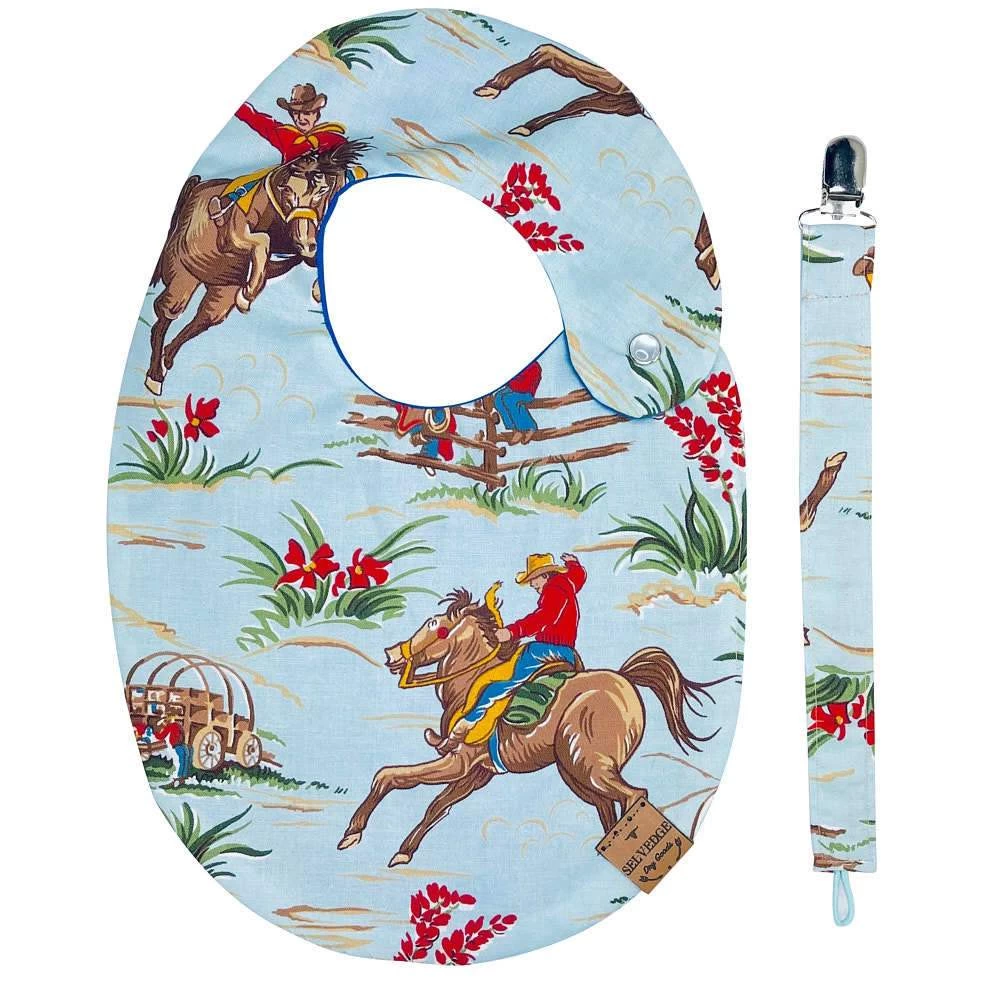 This cowboy bib set makes the perfect gift! Made of 100% cotton with flannel backing. Features snap closure.