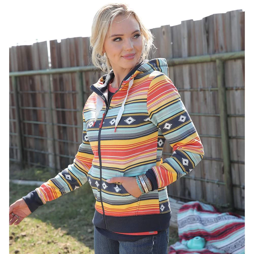 Switch gears to fall wardrobe selections with this printed full zip hoodie. Cozy cotton-poly brushed back French terry material provides just the right coverage to knock back an evening chill. Design details include a bright, multicolored Southwest striped pattern and contrast rib knit trim.
