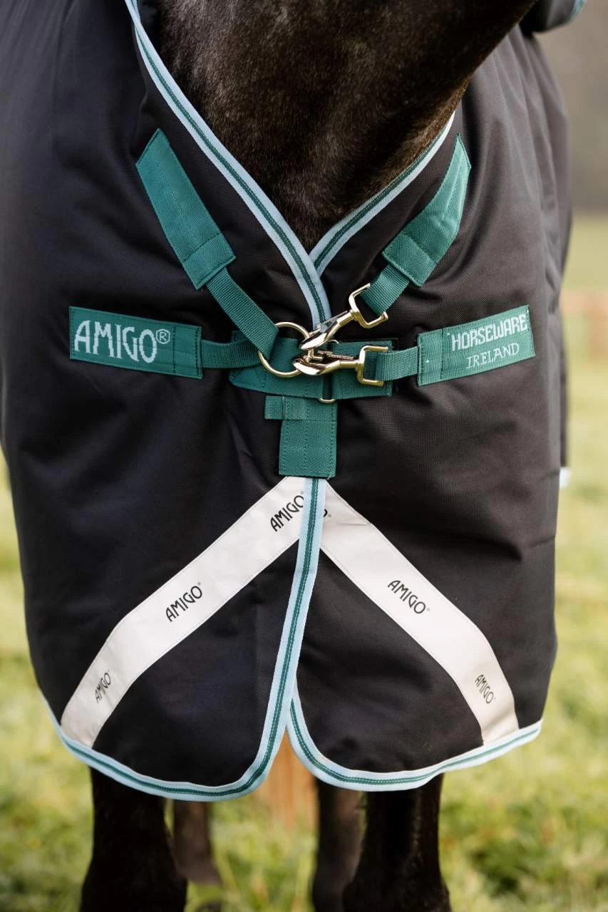 The Amigo® Bravo 12 Plus Horse Turnout is a waterproof and breathable blanket. Made from a strong waterproof and breathable 1200D polyester outer, polyester lining and fiberfill inside for warmth. Now with our patented V-Front closure and cut to our surefit neck design and gorgeous colors. Incorporating our front and rear leg arches with 3 cross surcingles, shine enhancing polyester lining and a detachable hood as standard.