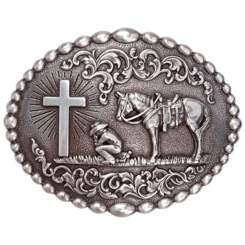 This kids buckle by M&F will make a perfect gift! Actual colors and patinas may vary slightly. Nocona protects the finish with a protective coating to prevent tarnishing. This oval buckle measures 4″ x 3″. The image in the center is of a cowboy praying next to a cross and his horse. This is a popular image that most parents would love their kid to be wearing at a rodeo event.