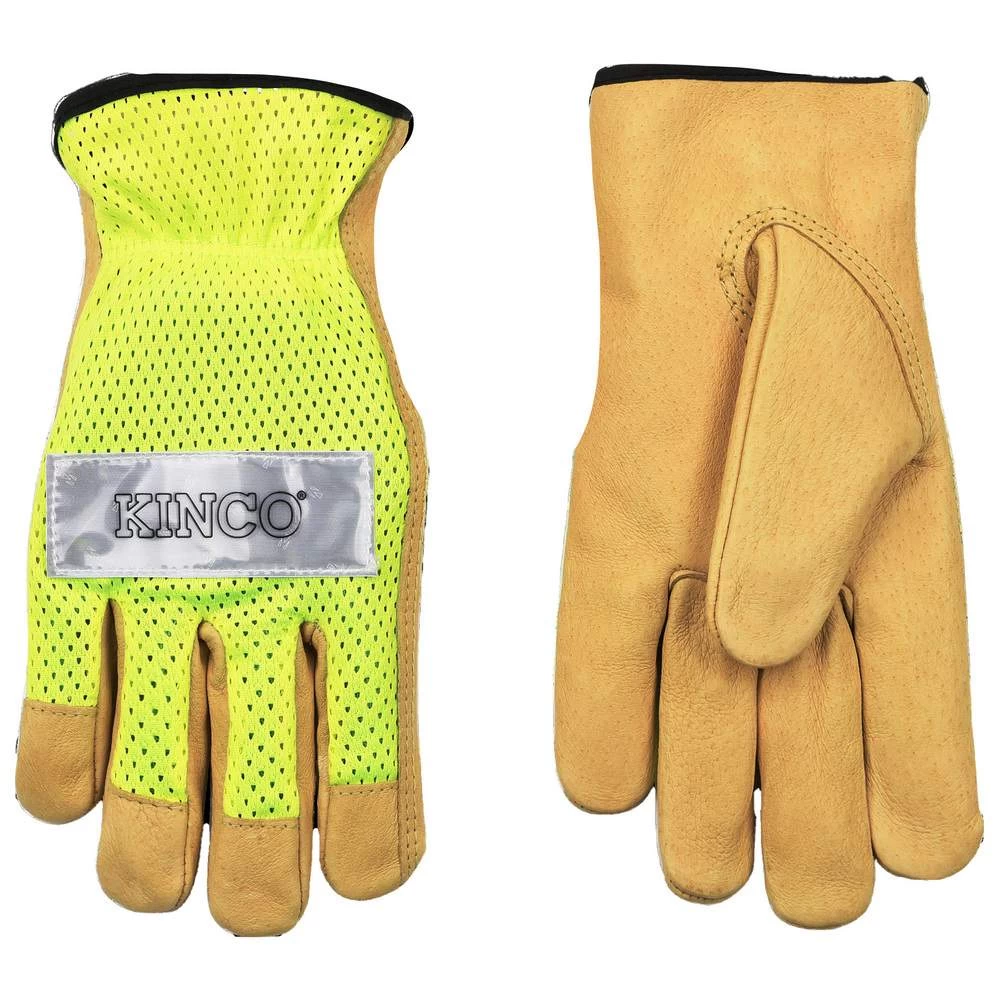 These Kinco gloves are made of grain pigskin palms and fingers providing supple yet durability from wear and tear while shielding hands while doing chores and general labor. They have an easy-on cuff with shirred elastic wrist for quick on and off use. The out-seam helps eliminate rub points and the leather welt at the base of the middle and ring fingers reinforces seam strength and durability. They have an added lime green high visibility mesh back and a 3M Scotchlite reflective knuckle strap for reflectivity. Suggested uses: chores, livestock handling, fencing, mowing, landscaping, gardening, all purpose work/chores, farming, ranching and equine. Sold as one pair. PW908