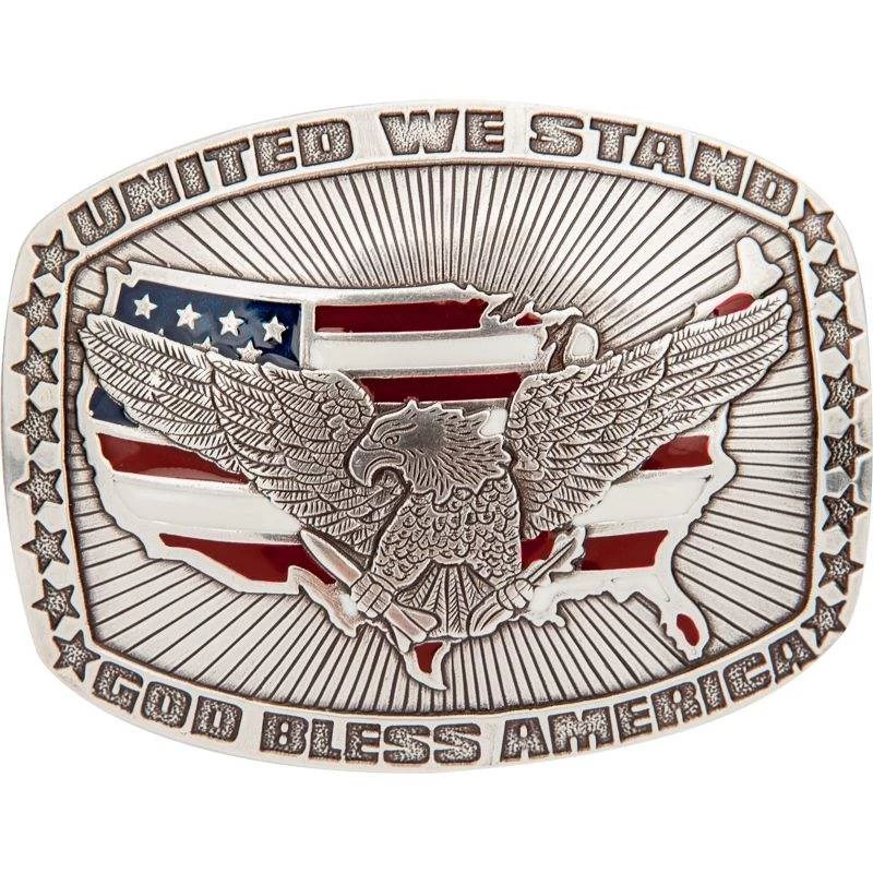 This American Flag Buckle from M&F Western Products will go perfectly with any belt! This is a silver rectangular buckle with United We Stand and “God Bless America” working on it. It also has a United States American flag and a raised eagle.