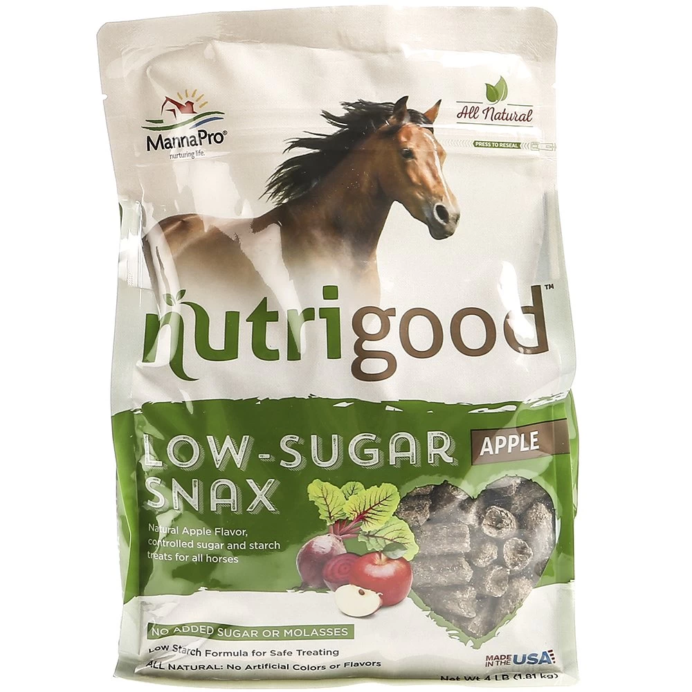 We pack a lot of goodness into our nutrigood treats. All-Natural ingredients. Irresistible, natural apple or carrot/anise flavor horses can’t resist. The peace of mind that your horse isn’t getting extra sugar and starch he may not need. Low-Sugar Snax are great for all horses, whether they need a controlled sugar or starch diet, are overweight, or if you simply like to feed less sugar. There is NO sugar or molasses added to our formula, ensuring no more than 6.5% sugars, which are present naturally. Low-Sugar Snax are more than good, they’re nutrigood.