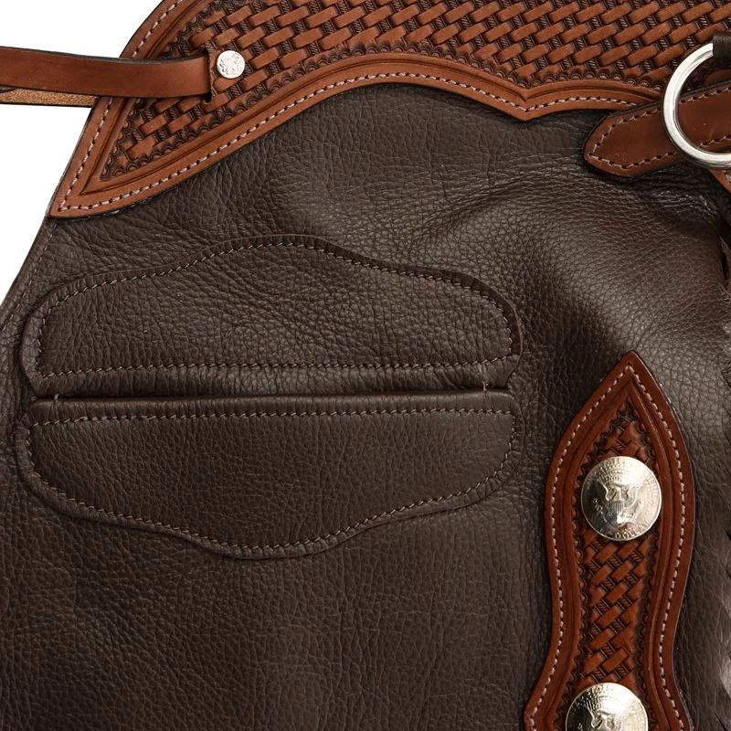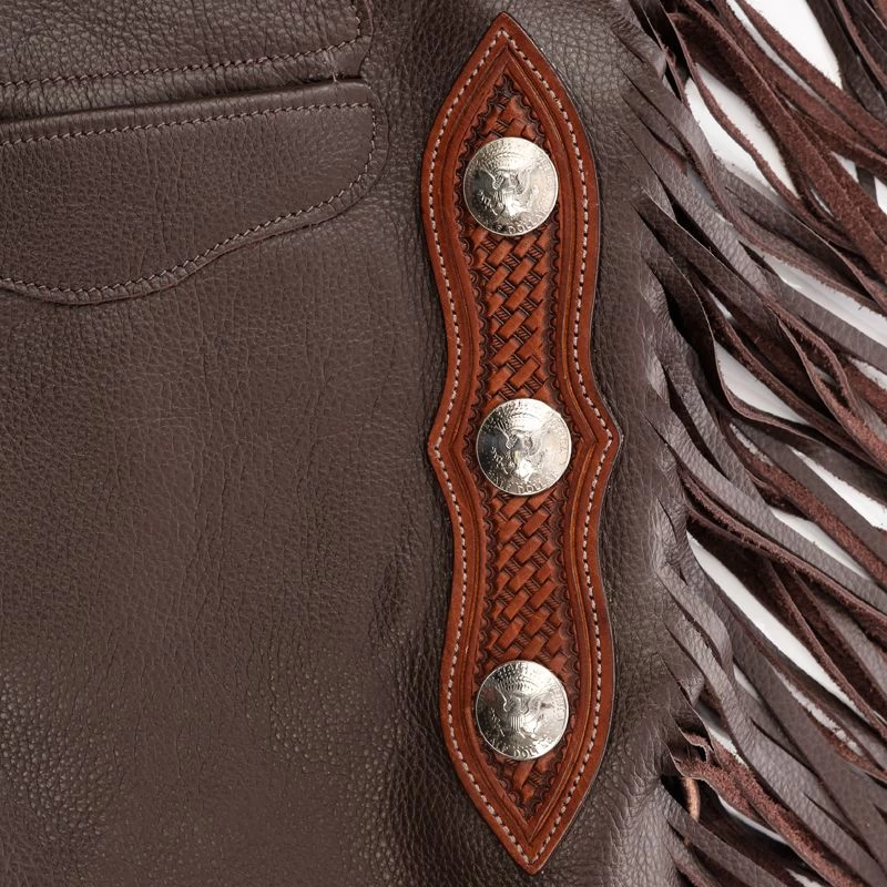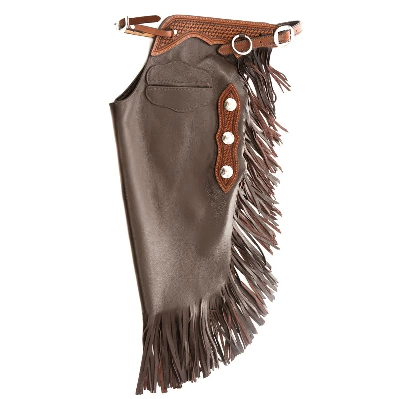 Handmade in the USA using heavy weight leather for durability in the toughest of extremes. Hand-sewn welt pockets allow for quick and easy access even when in the saddle. Chaps and chinks come with stainless rings in order to easily pack a tie-string.