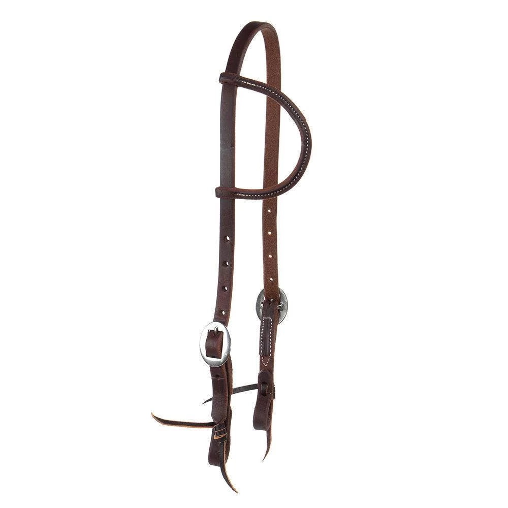 NRS double cart buckle, slip ear headstall. Amish Made, 5/8″ Oiled Harness Leather with Stainless Steel Hardware and Blood Knot Ties