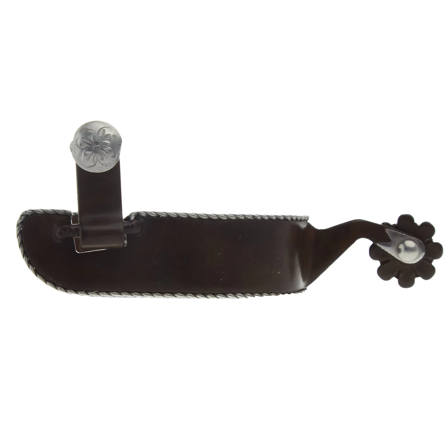 This Women’s Roper Edge Spur has an antiqued look with an oval cup. It features a 7/8″ band with stainless steel rope edge design, and a 1 1/4″ shank. 1″ 8 pt Rowel. 230124