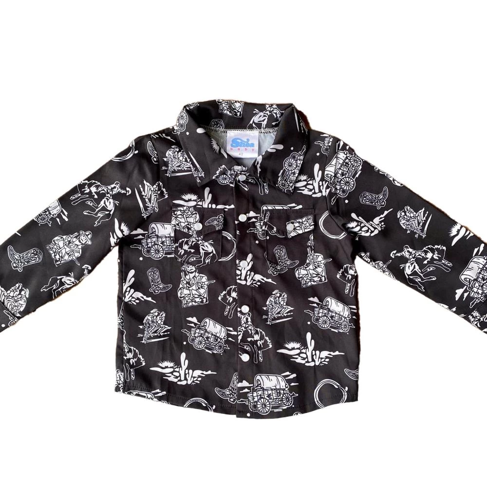 Your little cowboy will arrive in style in this adorable Shea Baby Boys Black Cowboy Print Pearl Snap Shirt.