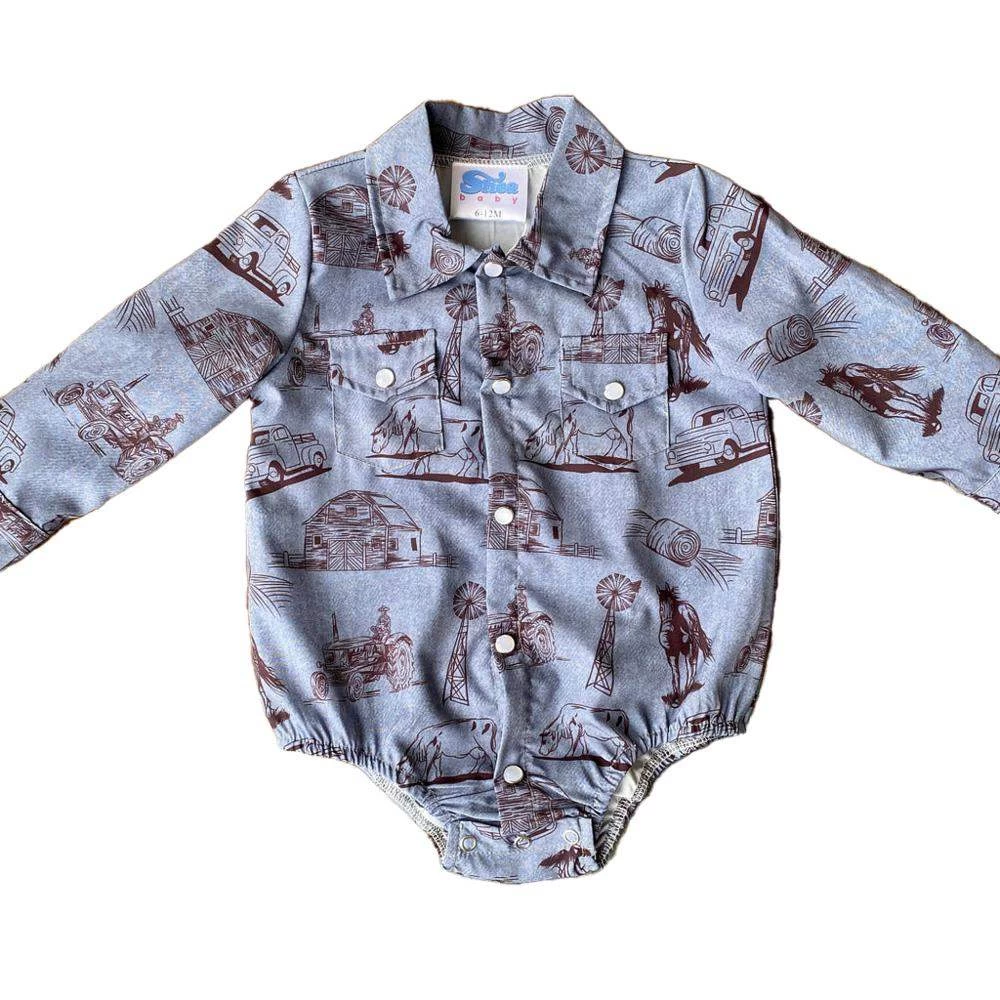 All little cowboys or little ranch hands need this Shea Baby Farm Print Pearl Snap Onesie.
