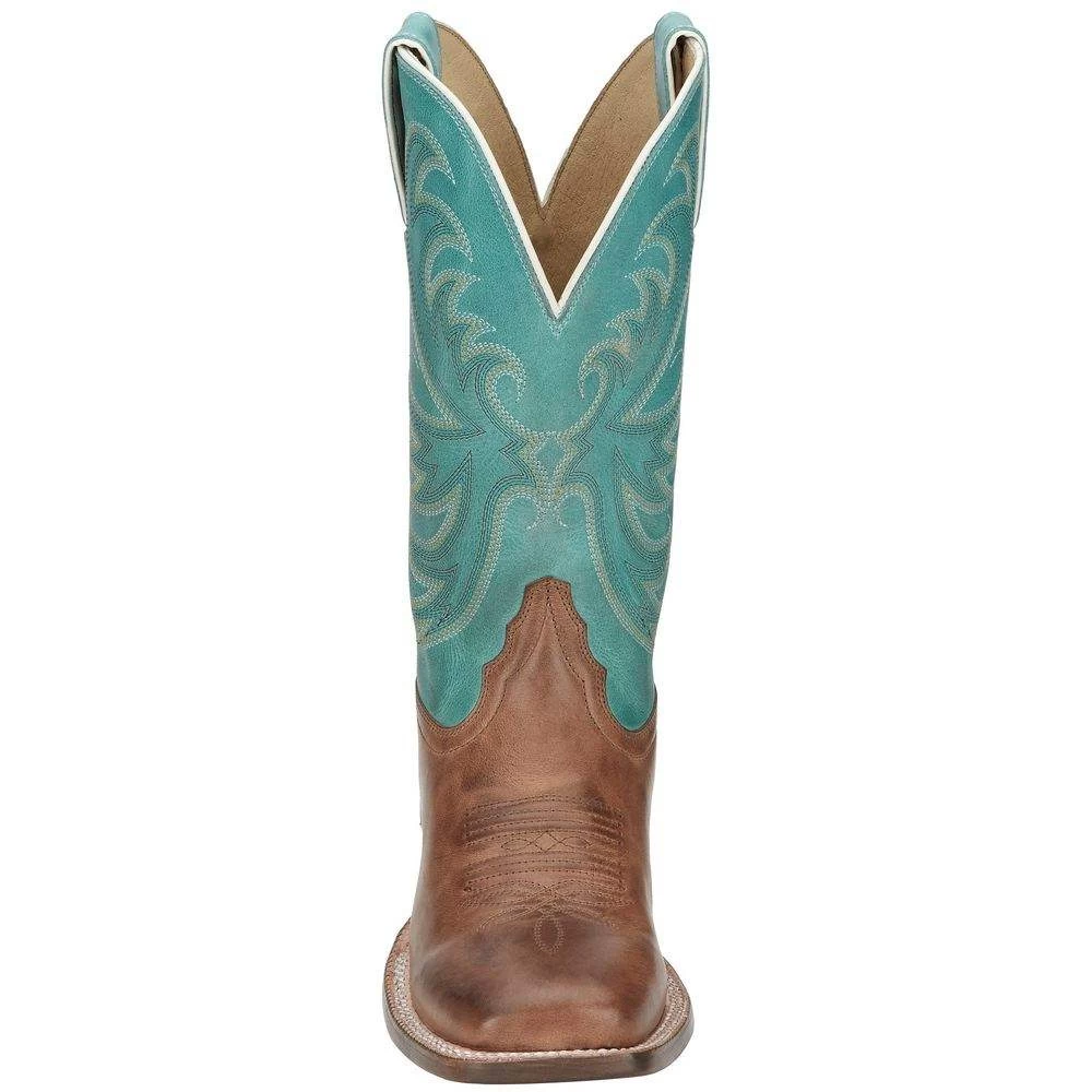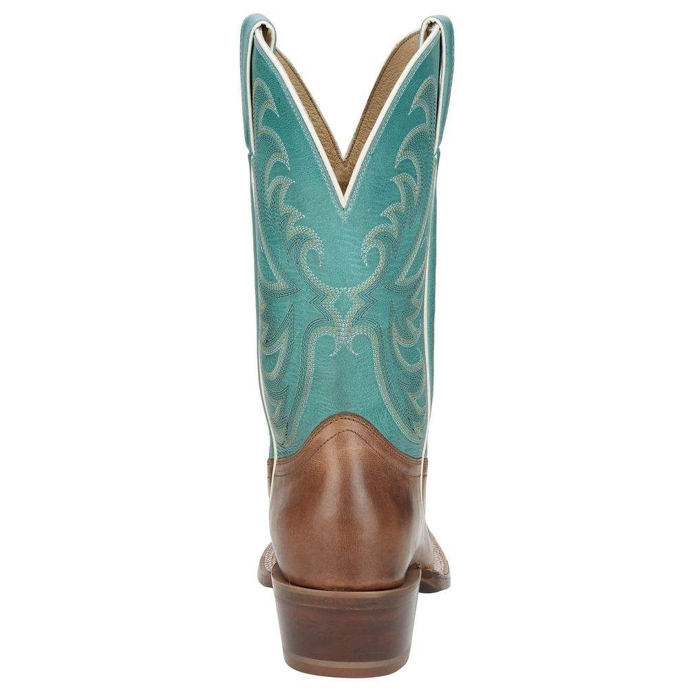This 11in. wide square toe silhouette brings together a lagoon blue leather upper with a brown leather vamp. The western heel with spur ledge will keep you comfortable all day.