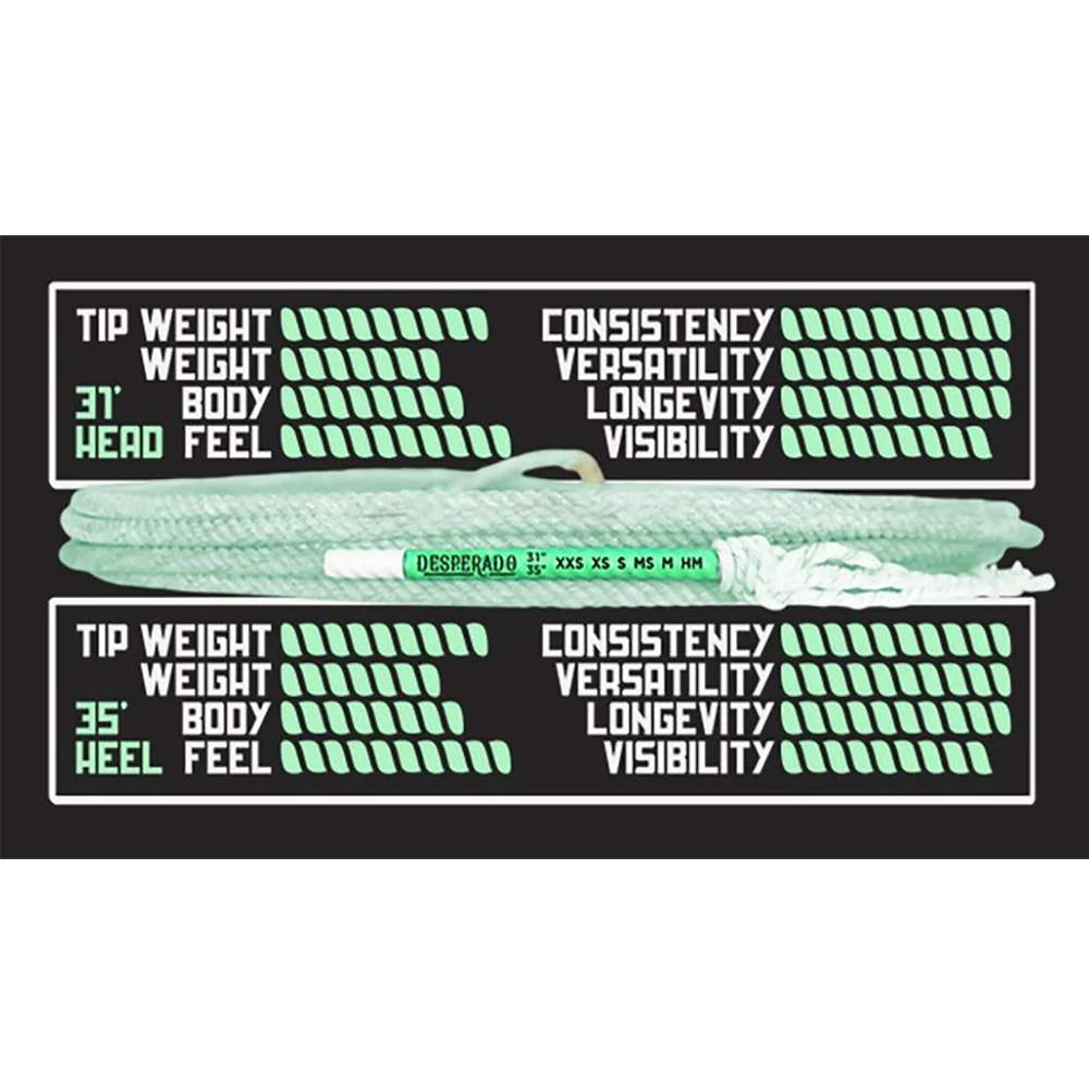 The Desperado Head Rope by Top Hand Ropes was meticulously designed and built from a specific blend of hand sourced fibers never before used in a rope. We gave immense and equal consideration to both the 5-Strand head rope and 4-Strand heel’s construction. No matter which side of the box you swing from, you’ll have everything you need to get the job done. DESPERADOHD