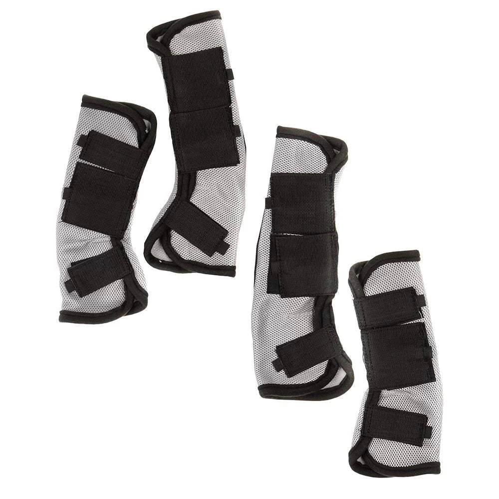 Durable comfort mesh fly boots protect legs from biting insects and provide UV protection to the lower leg. Large “quick grip” closures make for easy on/off. Lower straps have elastic to provide comfort allowing the boot to move with your horse. A flexible spine provides support to keep the boot upright while a neoprene roll, located above the joint, keeps boot from collapsing as the horse moves. Set of 4.