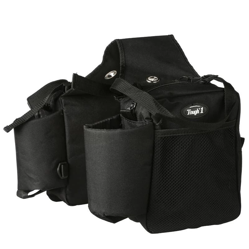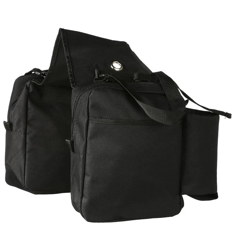 A super accessory for the serious trail rider. This saddle bag has all types of compartments to keep a variety of items secure during those long rides in the great outdoors. Constructed of a heavy denier Nylon. Fits both English and western saddles. Two insulated water bottle pockets2 adjustable back straps for rainwear and bed rollsOutside mesh pocket on one bag and a solid pocket on the otherZipper closuresEach bag measures 8″ wide by 11″ high and about 4″ thick