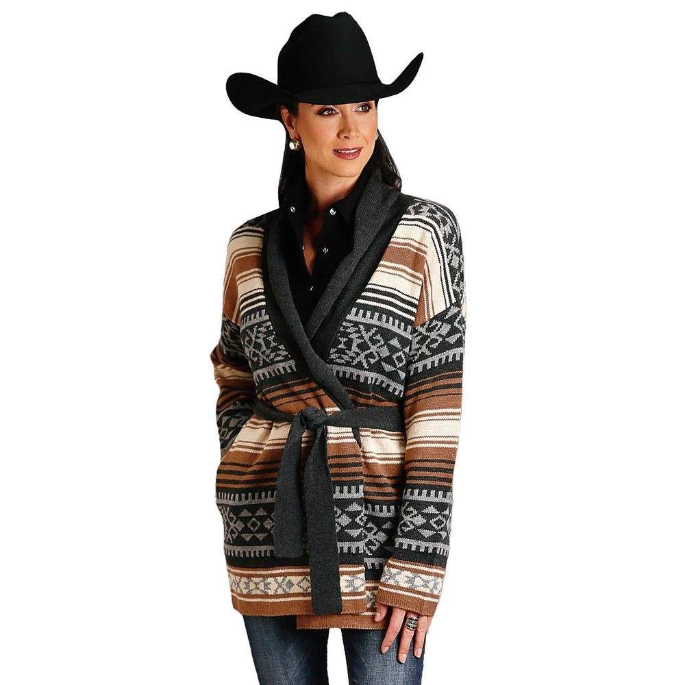 Featuring a rich brown serape inspired pattern, this belted shawl collar cardigan sweater features drop shoulders, side seam pockets and a self tie waist. Made from a cozy wool blend, it has a flowing, easy drape that pairs perfectly over your favorite jeans.