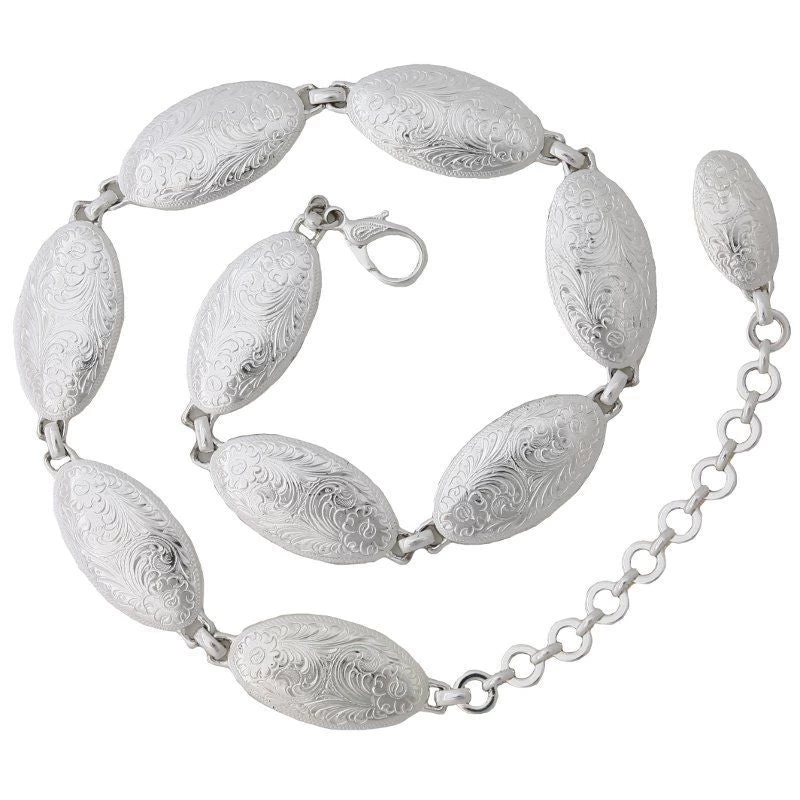 This ladies belt by Tony Lama is a silver chain belt that has oval conchos that have floral engraving.