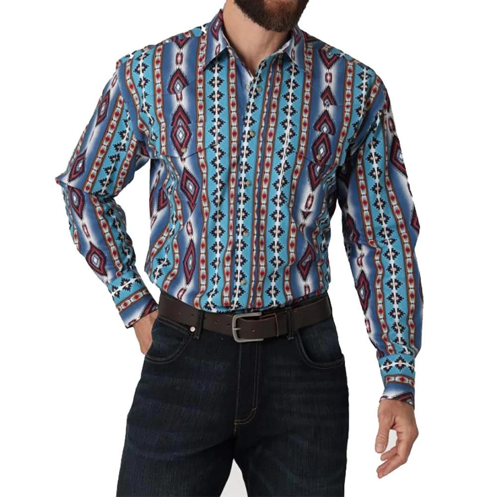 Wrangler’s Checotah® has a home in the closets of cowboys around the world. This men’s Checotah long-sleeve western snap Navajo-inspired printed shirt is designed to make a statement no matter the destination. It features a classic fit, a spread collar, pointed yokes, two snap flap pockets with a convenient pencil slot, adjustable cuffs, and a full-length snap closure for the finishing touch. Best of all, it’s crafted from cotton for uncompromising comfort. Look sharp at a moment’s notice by wearing your Checotah shirt with a Wrangler Retro® or Cowboy Cut® jean.